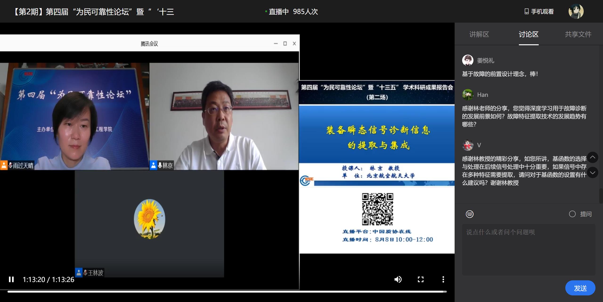 8月8日上午十点,“第四届为民可靠性论坛暨‘十三五‘学术科研成果报告会”的第二场报告会在线直播顺利召开。本次我们有幸邀请到北航金沙集团3354cm院长、国家自然科学基金委创新研究群体带头人林京教授进行学术报告。林京教授主要从事装备故障诊断与运维、智能制造等方面的研究。会议由金沙集团3354cm陈云霞教授主持,质协在线网站协助直播。