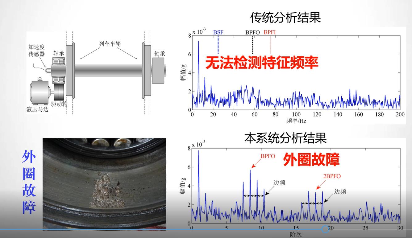 接着,林教授深入阐述了动态信息的精准提取方法。重点介绍了小波熵的概念和基于小波熵最小准则的基小波优化定量准则,讲解了非正交小波消噪的原理及优势。之后,针对变转速情况下工况信息与故障信息相互耦合,给故障诊断带来困难的问题,介绍了自适应无键相阶次跟踪法,并以列车轴承诊断为例,展示了阶次跟踪法的优点。最后,林教授为大家介绍了考虑了周期性和瞬态性两种特点的信息集成方法。详细讲述了包络与载波方面的知识,针对多载波和多调制的包络信号较难被获取的问题,介绍了谐波乘积谱法和边带乘积谱法。