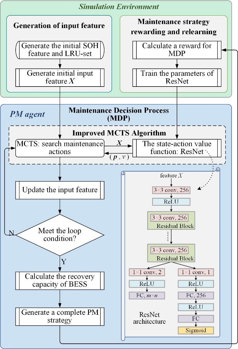 在“系统级”,研究团队以“微网”和“电池储能系统”为对象开展研究。考虑智能电网的两种运行模式(并网、孤岛运行),突破分布式能源性能共享下的动态运行模式,给出了考虑不完美维修的电力系统可靠性评估模型。此外,考虑电池储能系统的预防性维修决策,结合蒙特卡罗树搜索算法和深度神经网络,开发了一种基于深度强化学习的序贯决策算法,在保证维护费用的同时优化了系统可靠性。