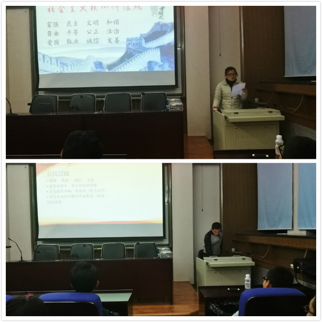 会议开始,ZY16142班团支书邱耀首先对会议内容进行了简单介绍,并从概念内涵、价值意义以及学习践行三个方面展开对社会主义核心价值观的介绍。最后以一段解说性微视频进一步从国家、社会和公民三个层面,将社会主义核心价值观24个字“富强、民主、文明、和谐、自由、平等、公正、法治、爱国、敬业、友善”联系在一起,加深同学们的理解。