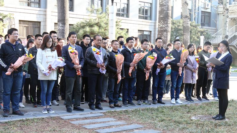上午8时,献花仪式正式开始,学院分团委书记邵英华老师主持本次献花仪式。本科2014级党支部李姝昱同志首先代表学院全体学生党员进行了发言,她以生动朴素的语言带领大家一起回顾了杨为民教授开拓进取、献身国防的峥嵘岁月以及作为一名优秀共产党员所体现出的淡泊名利、廉洁自律的高尚情怀,并以“为民精神”为标杆,激励学院广大学生党员为党和国家的事业奋力拼搏、无私奉献,传承杨为民教授的遗志并继续开拓中国可靠性事业的未来。接着,在场党员集体默哀,深切表达对杨为民教授积极进取、献身科研精神的崇高敬意。随后,学院党委书记赵廷弟老师以及其他党委委员,本科生和研究生各党支部代表依次向杨为民教授塑像敬献鲜花,仪式在庄重肃穆的氛围中结束。
