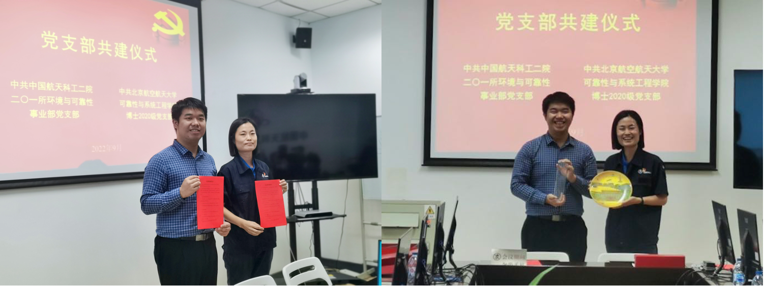 在迎接党的二十大胜利召开之际,2022年9月21日,北航金沙集团3354cm博士2020级党支部前往中国航天科工二院二〇一所,与该所环境与可靠性事业部党支部开展了支部共建活动。活动由博士2020级党支部书记方子唯与环境与可靠性事业部党支部书记戴维共同主持。